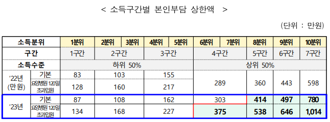 올해는 국민소비자물가 변동률을 적용해 다음과 같이 상향 조정했습니다. 저소득층과 중위소득층은 지난해에 비해 크게 오르지 않았지만 10분위는 지난해 598만 원에서 올해 1014만 원으로 70% 가까이 상승했습니다. 고소득층의 혜택이 상당히 위축된 것입니다. 최근 국민건강보험공단에 대한 지출이 늘면서 고소득층의 혜택을 줄이고 건강보험 재정 악화를 막기 위해서입니다