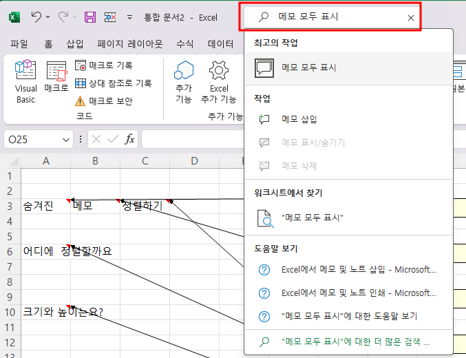 엑셀 시트에 숨겨진 메모를 한 번에 모두 보이게 하는 방법은 생각보다 간단합니다. '보기' 탭에서 '모든 메모 보기' 옵션을 선택하면, 모든 메모가 시트에 표시됩니다. 이를 통해 개별적으로 메모를 확인할 필요 없이 전체 내용을 한눈에 볼 수 있게 됩니다. 더욱 간단한 방법은 엑셀 돋보기창에 "메모 모두 표시"를 검색하면 메뉴가 바로 나옵니다. 클릭하면 끝.